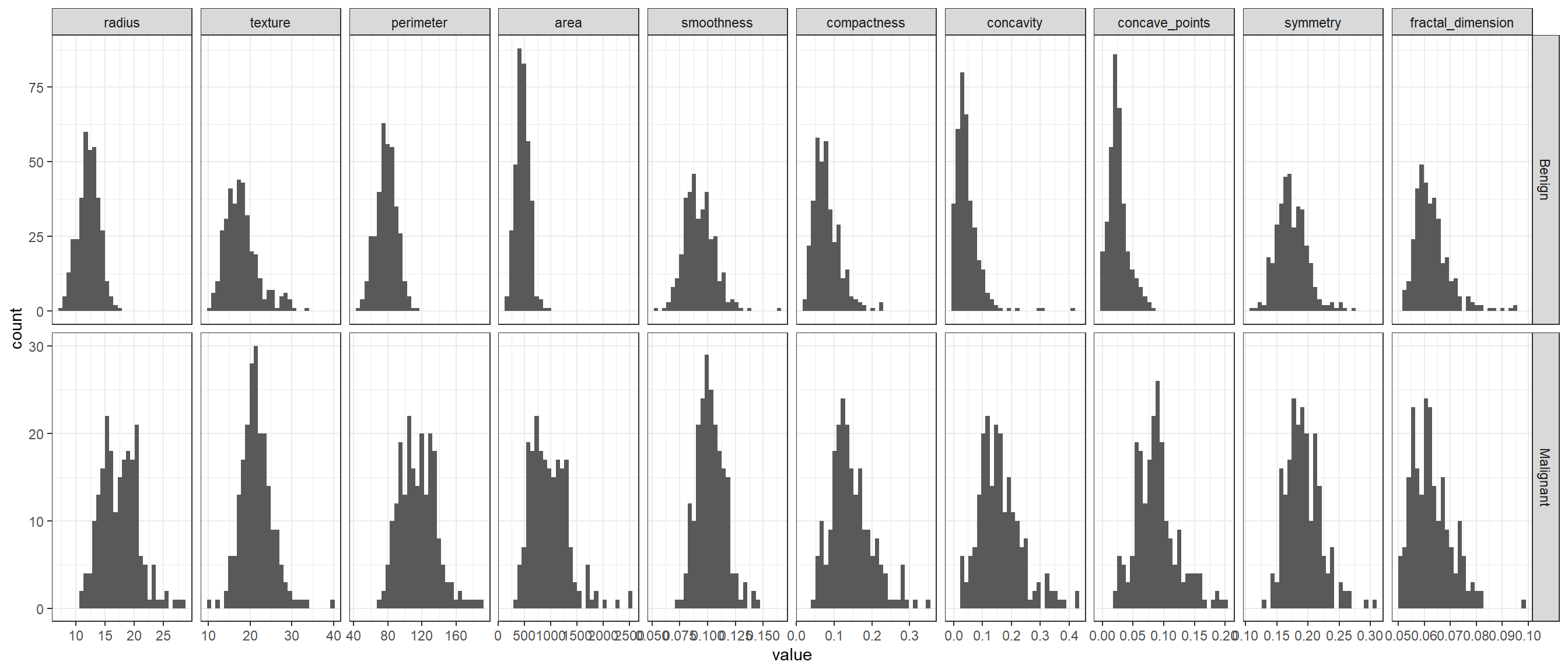 # Data for histogrammelted_data <-melt(na.omit(data0), id="diagnosis")melted_data$diagnosis <-ifelse(melted_data$diagnosis =="M","Malignant",ifelse(melted_data$diagnosis =="B","Benign","NA"))# Plot the histogram of all the variablesggplot(melted_data,aes(value))+geom_histogram(aes(),bins =30)+facet_grid2(diagnosis~variable, scales="free")+theme_bw()