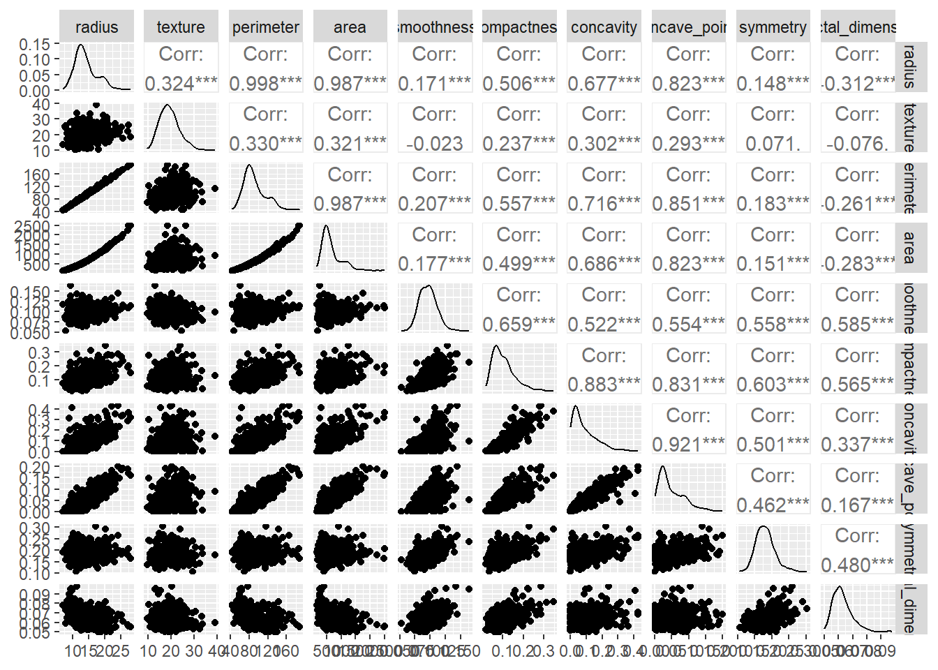 library(reshape2)library(ggplot2)library(dplyr)library(ggh4x)library(GGally)library(pROC)library(glmnet)# Get data from github repopath <-"https://raw.githubusercontent.com/adityaranade/portfolio/refs/heads/main/breast_cancer/wdbc.data"data00 <-read.table(path, sep =",", header =FALSE)data0 <- data00[,2:12] # Use only first 11 columns# Data processinghead(data0)