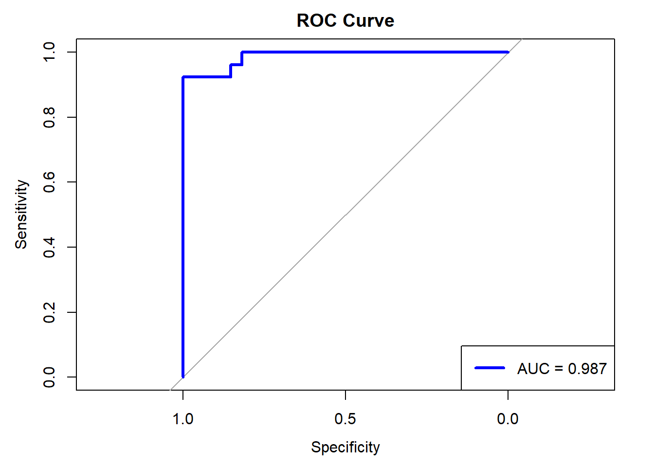 # Compute ROC curveroc_curve <-roc(data_test$response,as.vector(y_pred_prob))# Calculate AUCauc_value <-auc(roc_curve)# Plot the ROC curveplot(roc_curve, col ="blue", lwd =3, main ="ROC Curve")# Add AUC to the plotlegend("bottomright", legend =paste("AUC =", round(auc_value, 3)), col ="blue", lwd =3)