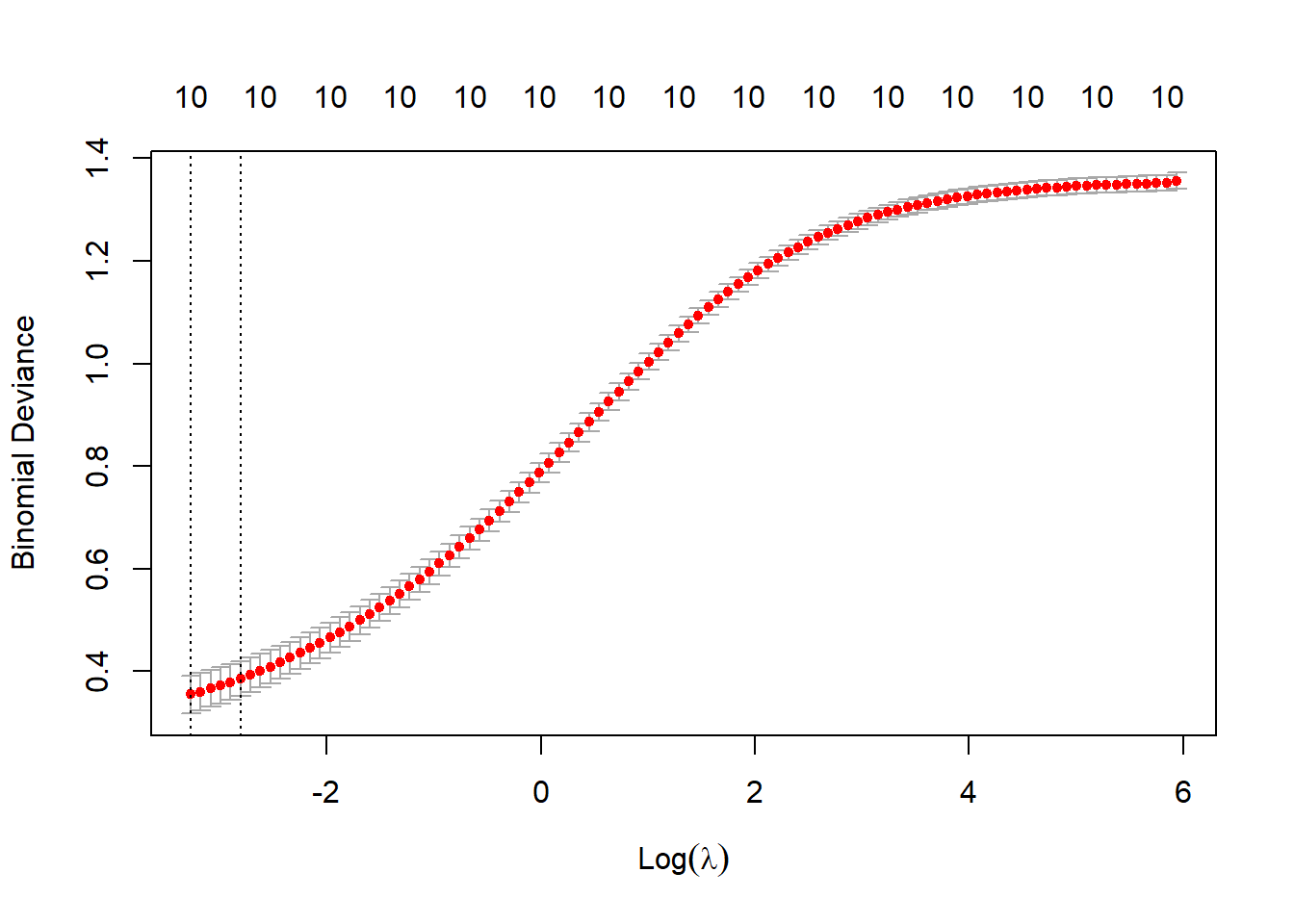 # Fit the final model with the best lambda final_model_l2 <-glmnet(as.matrix(data_train[,-ncol(data_train)]), data_train[,ncol(data_train)],family ="binomial", alpha =0, lambda = best_lambda_l2)coef(final_model_l2,s = best_lambda_l2)