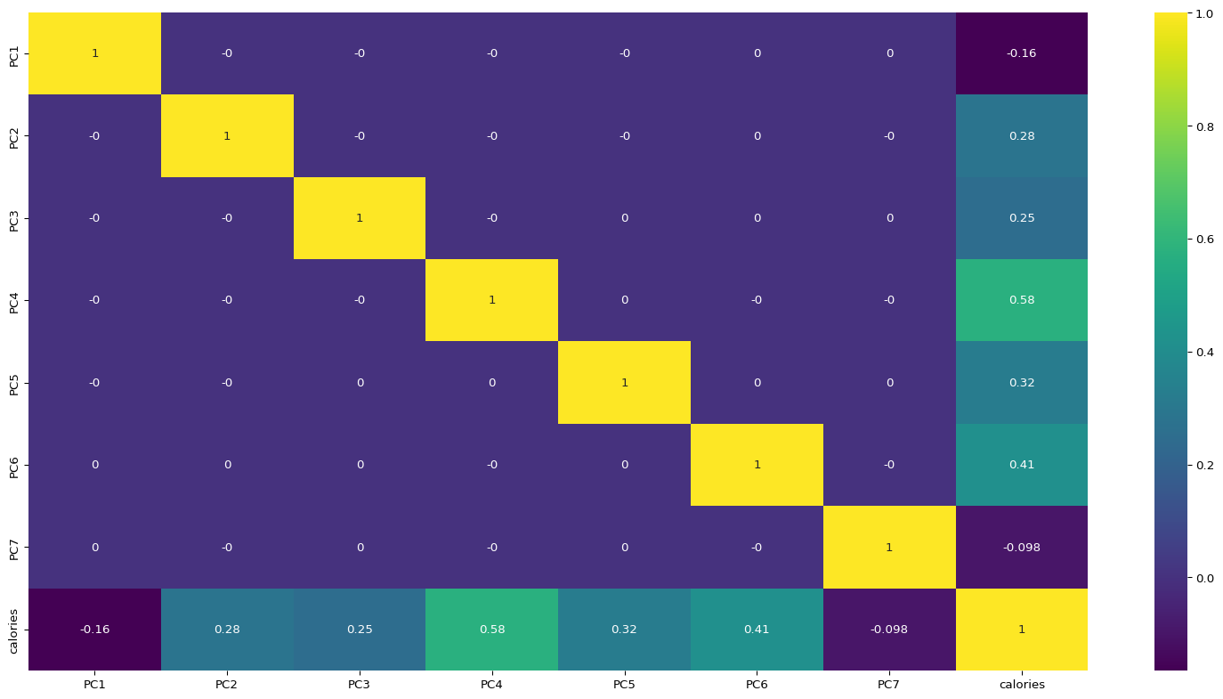 We can observe that only calories variable has correlation with the principal components and the correlation between the principal components is practically 0. So we will use the principal components to build a regression model.