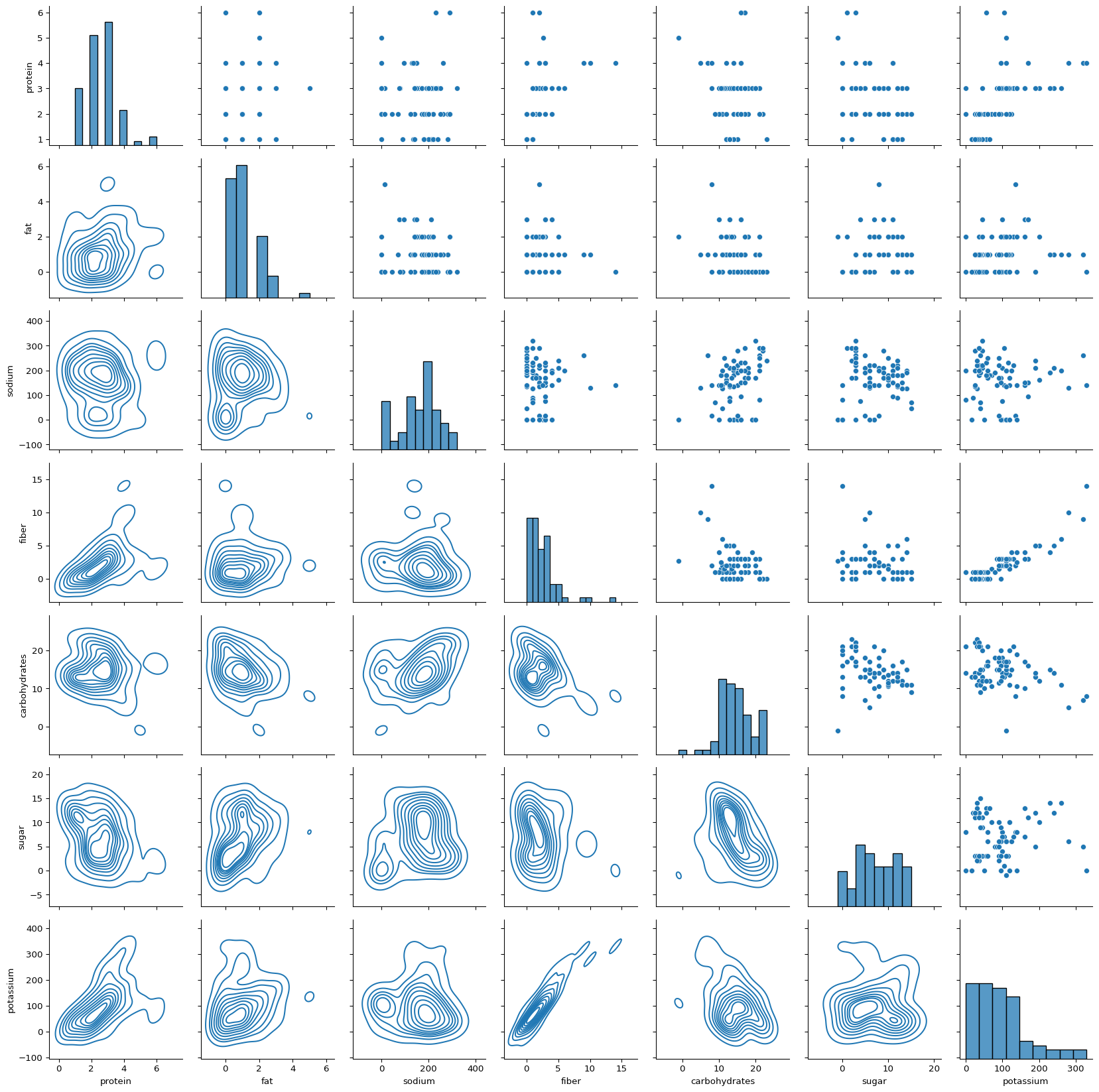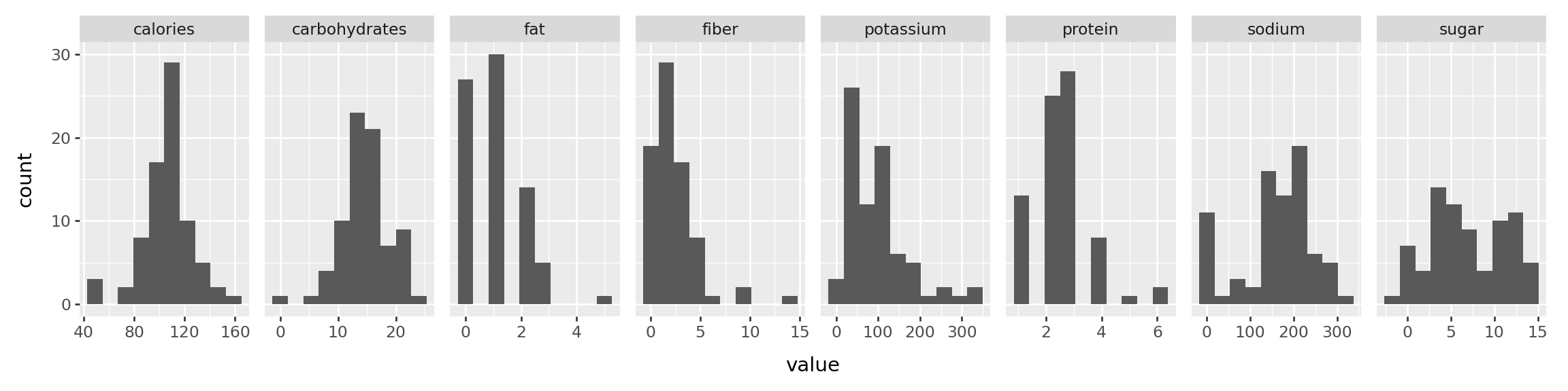 # select data for the histogramdf = df0[["calories", "protein", "fat", "sodium", "fiber", "carbohydrates", "sugar","potassium","name"]]df.head()# Use melt function for the histograms of variables df2 = pd.melt(df, id_vars=['name'])# df2.head()