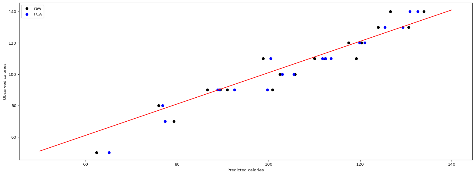 from sklearn.metrics import mean_absolute_error,mean_squared_errorprint("Mean Absolute Error:",round(mean_absolute_error(data_test["calories"],predictions_pca),2))print("Root Mean Squared Error:",round((mean_squared_error(data_test["calories"],predictions_pca))**0.5,2))