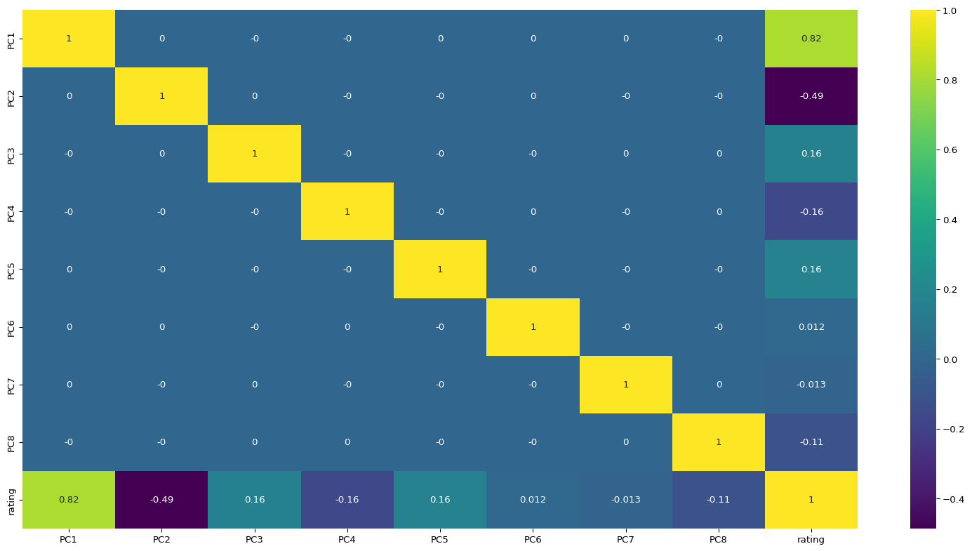 # Correlation plot for principal componentsplt.figure(figsize=(20,10))sns.heatmap(data_train_pca.corr().round(4),annot=True, cmap="viridis")plt.show()