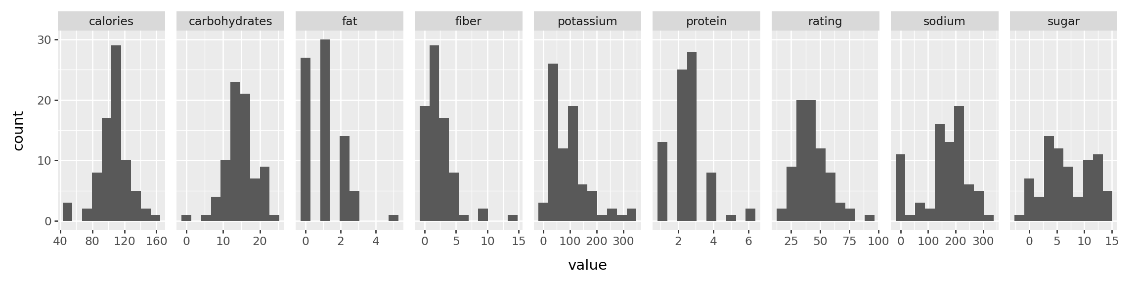 # Use melt function for the histograms of variables df2 = pd.melt(df, id_vars=['name'])# df2.head()p = ( ggplot(df2, aes("value"))+ geom_histogram(bins=10)+ facet_grid(". ~ variable", scales='free_x')+ theme(figure_size=(12, 3)) )# If we want the density on y axis# p = (# ggplot(df2, aes("value", after_stat("density")))# + geom_histogram(bins=10)# + facet_grid(". ~ variable", scales='free_x')# + theme(figure_size=(12, 3))# )p.show()