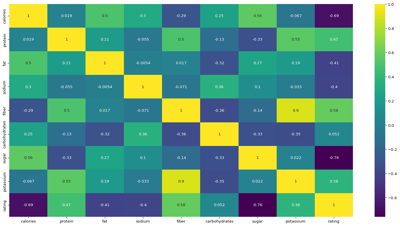 # Check the correlation between the variablesplt.figure(figsize=(20,10))sns.heatmap(df.iloc[:,:-1].corr(),annot=True,cmap="viridis")plt.show()