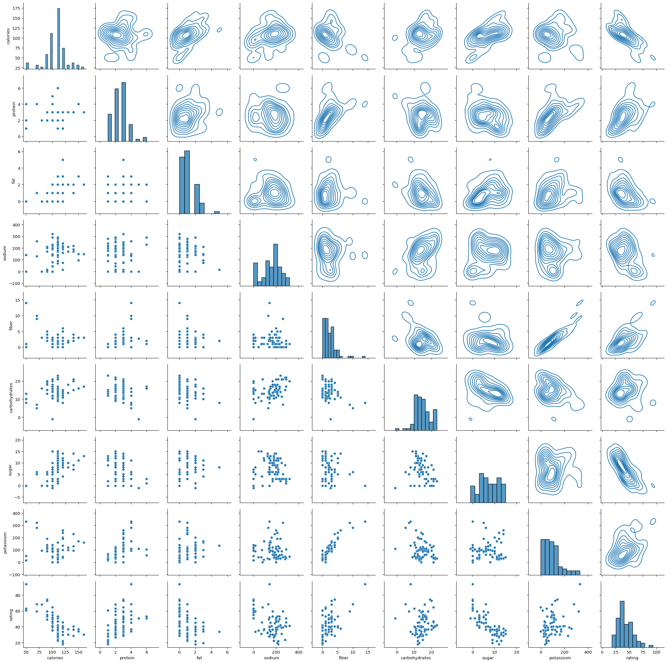 Rating variable has positive correlation with all the variables except sugar, sodium, fat and calories . This seems logical and will be useful when we build a regression model for the same. Next we take a look at the pairs plot which will give us idea about relationship between each pair of variables. Most important from the point of prediction is the last row where rating is the y axis and each of the variable is x axis.