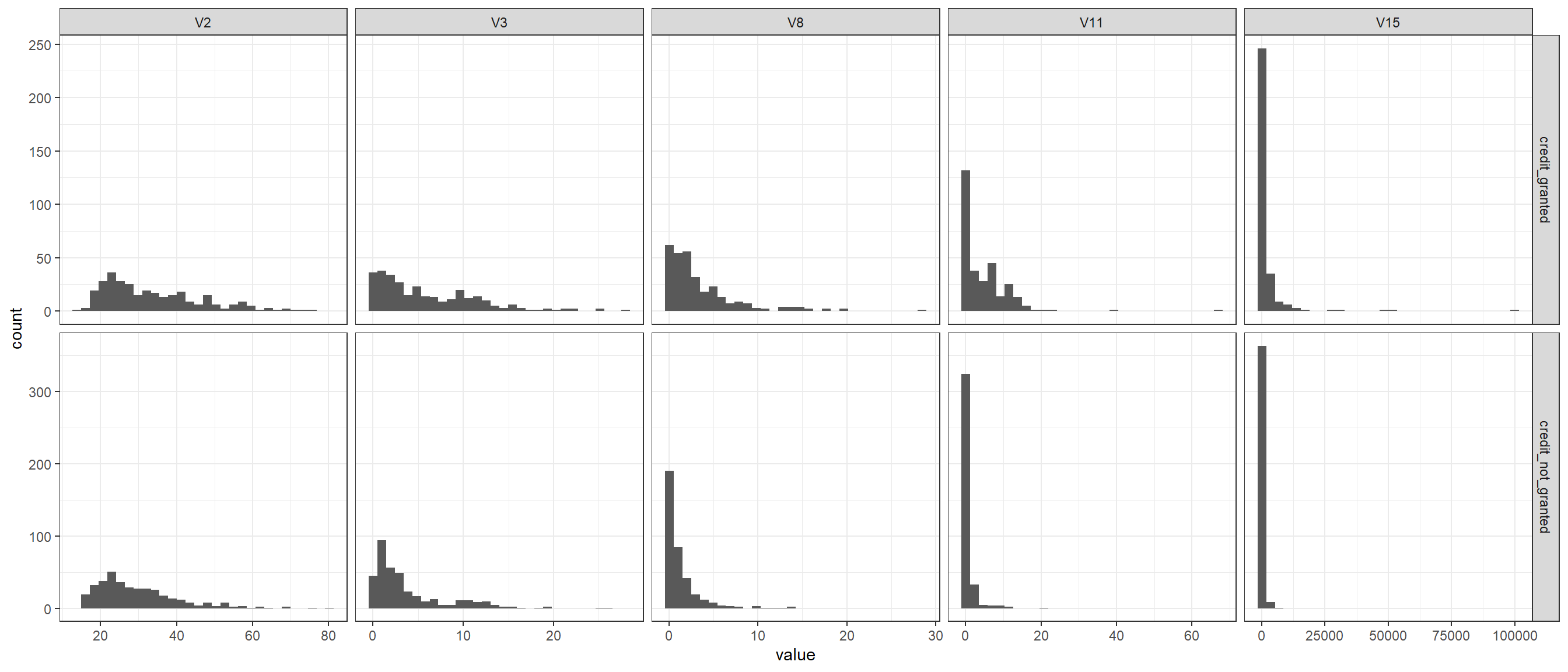 # Convert the data into appropriate factors or numbersdata0$V2 <- data0$V2 |>as.numeric()data0$V3 <- data0$V3 |>as.numeric()data0$V8 <- data0$V8 |>as.numeric()data0$V11 <- data0$V11 |>as.numeric()data0$V15 <- data0$V15 |>as.numeric()# Combine only numerical data along with the responsedata1 <- data0 |> dplyr::select(response,V2,V3,V8,V11,V15)data2 <- data0 |> dplyr::select(decision,V2,V3,V8,V11,V15)# data1 |> str()# Check the number of NA valuessum(is.na(data1))