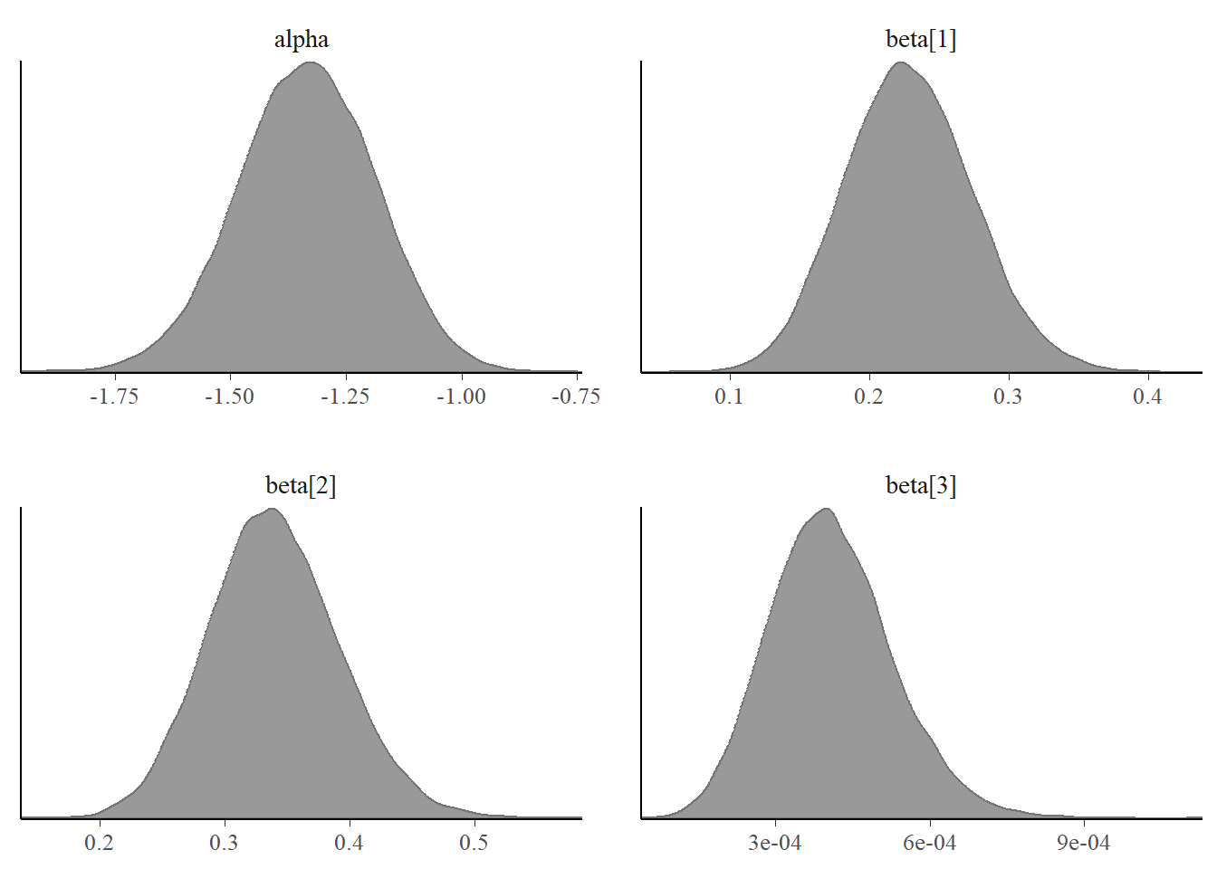 # Plot posterior distribution of parametersbayesplot::color_scheme_set("gray")bayesplot::mcmc_dens(fit$draws(c("alpha","beta")))