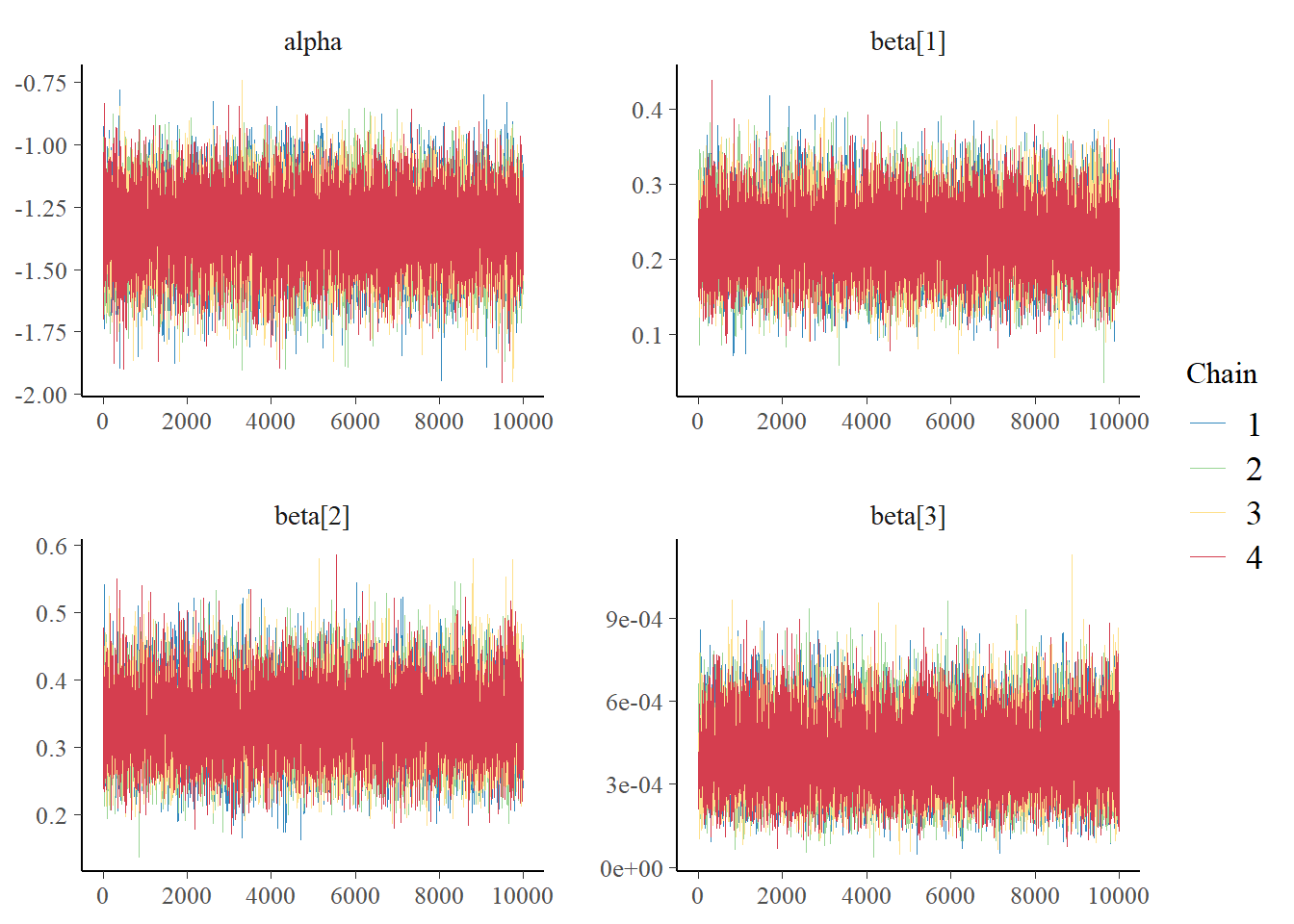 # starting value of parametersstart_parameters <-rep(list(list(alpha = opt_pars[1,2],beta = opt_pars[-1,2])),4)# Run the MCMC with optimized values as the starting valuesfit <- model_stan$sample(data = standata,init = start_parameters,seed = seed,iter_warmup =10000,iter_sampling =10000,chains =4,parallel_chains =4,refresh =10000,threads =32,save_warmup =FALSE)