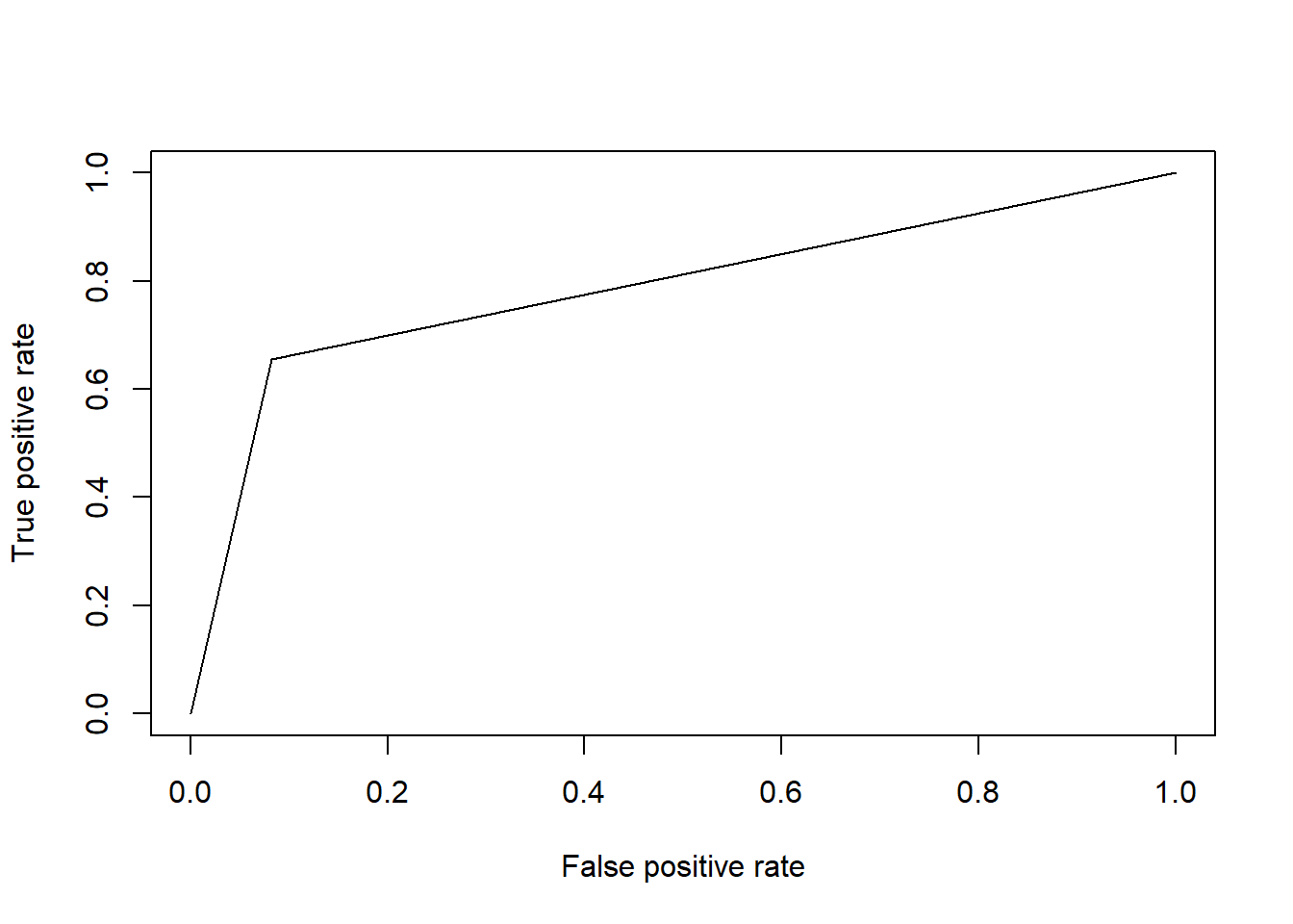 Our model has an accuracy of around 83% which indicates the model is correctly identifying the positive and negative cases in around 83% of the cases. Next, we look at the Receiver Operating Characteristic (ROC) curve. It plots the True Positive Rate (TPR) against the False Positive Rate (FPR). It is the visualization of trade-off between correctly identifying positive cases and incorrectly identifying negative cases as positive. A good model ROC curve which goes from bottom left to top left which means the model is perfectly identifying positive cases and does not identify negatives as positive. On the other hand, a ROC curve which is a straight line from bottom left to to right with slope 1 indicates the model is randomly assigning the positive and negative cases. Our curve is somewhere in between these 2 extreme cases and is decent. The area under the curve (AUC) is around 79% which is also decent.