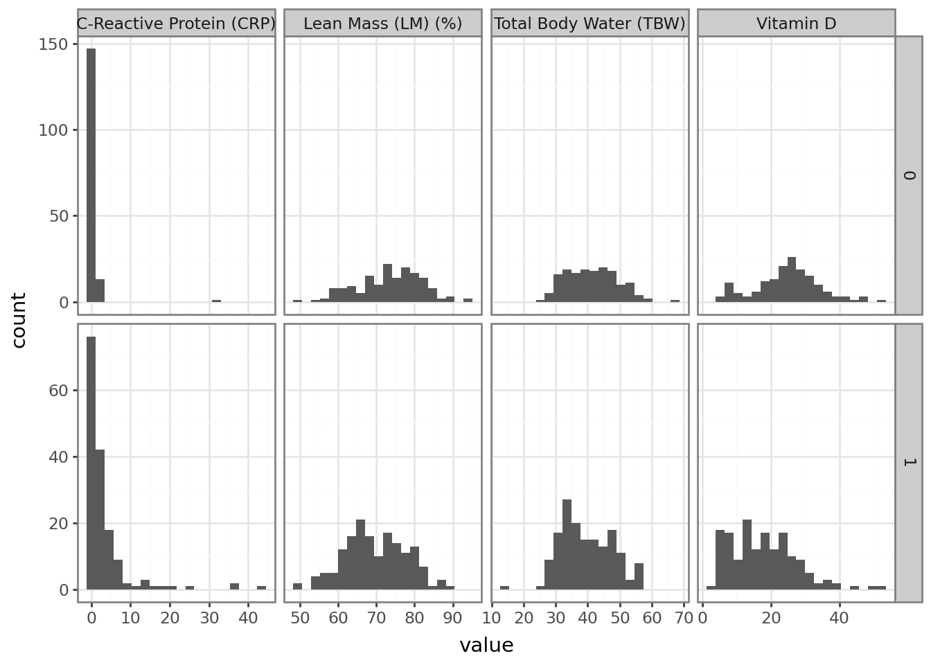 p = (ggplot(df2, aes("value"))+ geom_histogram(bins=20)+ facet_grid("Gallstone Status ~ variable", scales="free")+ theme_bw())p.show()