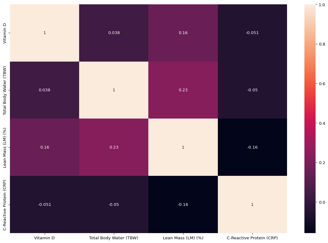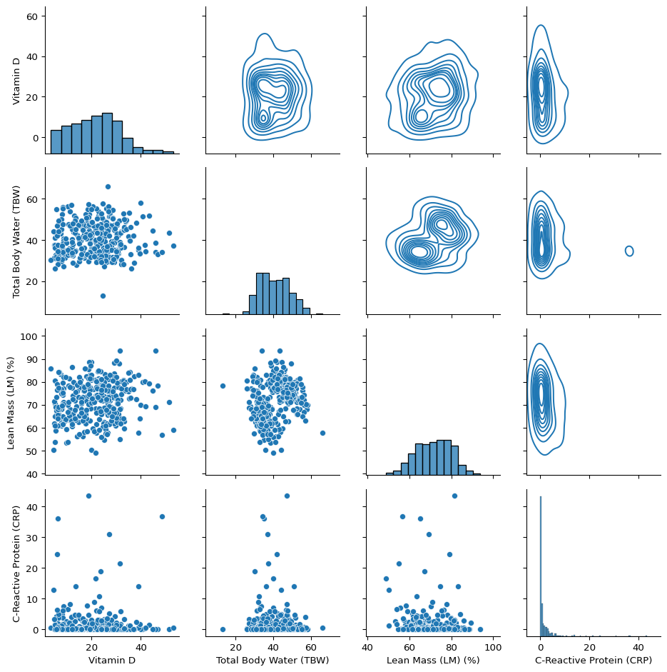 # select specific columnsdf = df0[["Gallstone Status","Vitamin D","Total Body Water (TBW)","Lean Mass (LM) (%)","C-Reactive Protein (CRP)"]]# df.head()