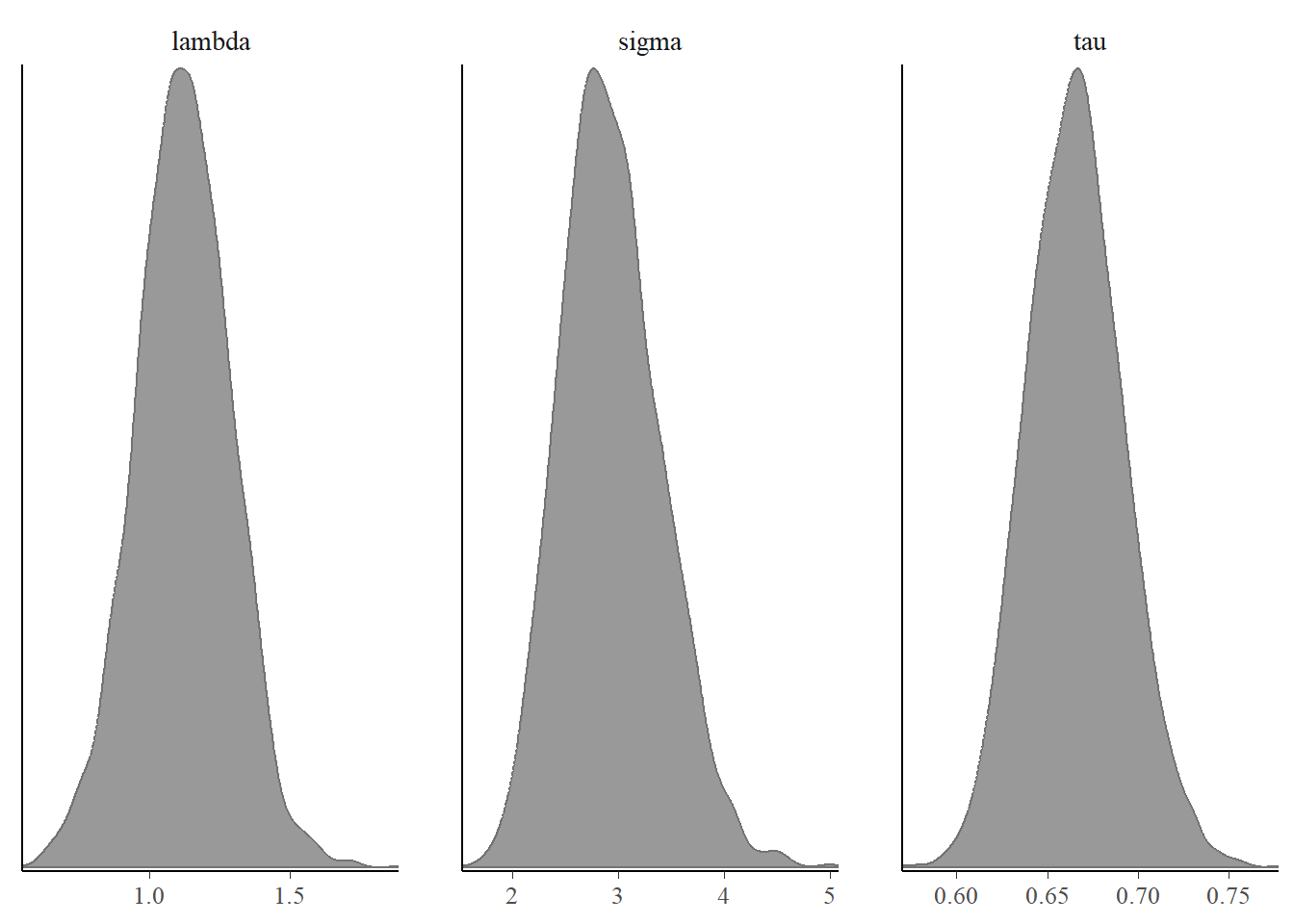 bayesplot::mcmc_dens(fit$draws(c("lambda","sigma","tau"))) bayesplot