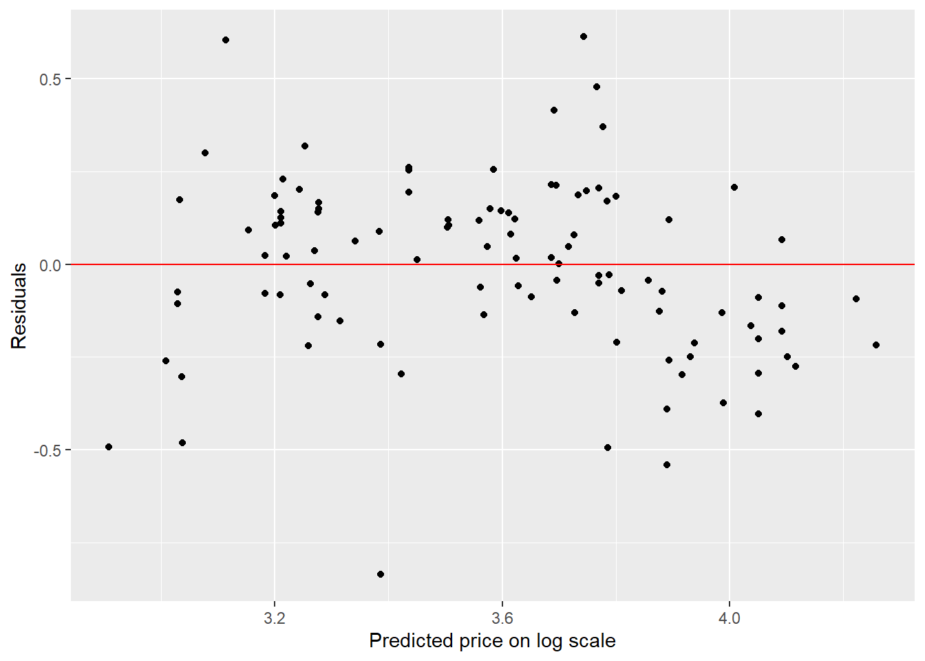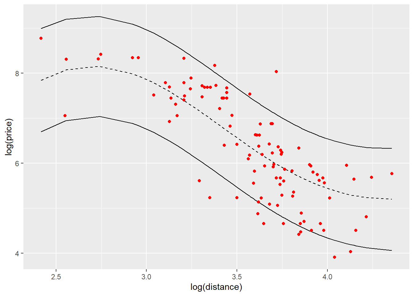 The black dashed line is the predictive mean price on log scale for distance on log scale. The black solid lines give the 95% upper bound and lower bound for predictions. The points indicated in red color are the observations in testing data set and we can see most of them are in the prediction bounds.
