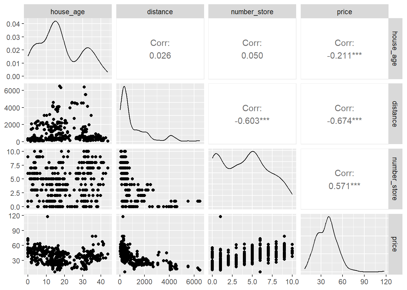 house_age is not related to distance and number_store which is not surprising. distance variable is positively correlated with number of stores which again not surprising. However price is negatively correlated with distance to nearest MRT station as well as house age and positively correlated with number of stores in the vicinity which is again logical. Next we look at the pairs plot which will show the bivariate scatter plots as well as the correlation between each variables. Scatter plots in the last row is of interest as it shows the pairwise scatterplots where price is on the y axis and the other variables are on the x axis.