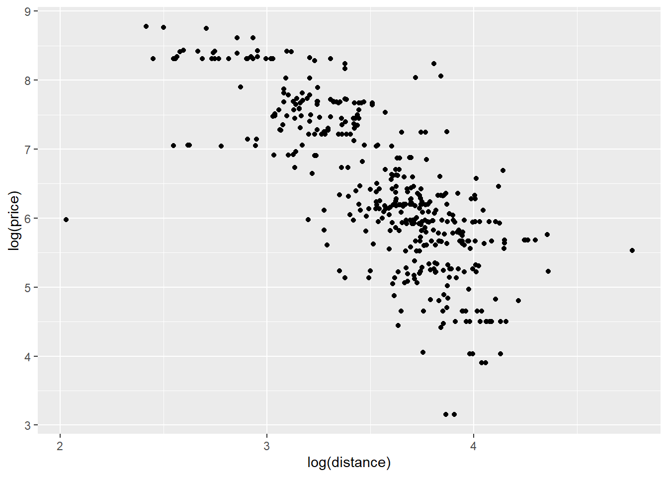 The scatterplot of price vs. distance does not look linear but more of curved. We will focus on predicting price based on the distance variable. We will look at a simple linear regression where we will try to predict price as a function of distance. First let us convert the price and distance variable to log scale and look at scatterplot of the same.