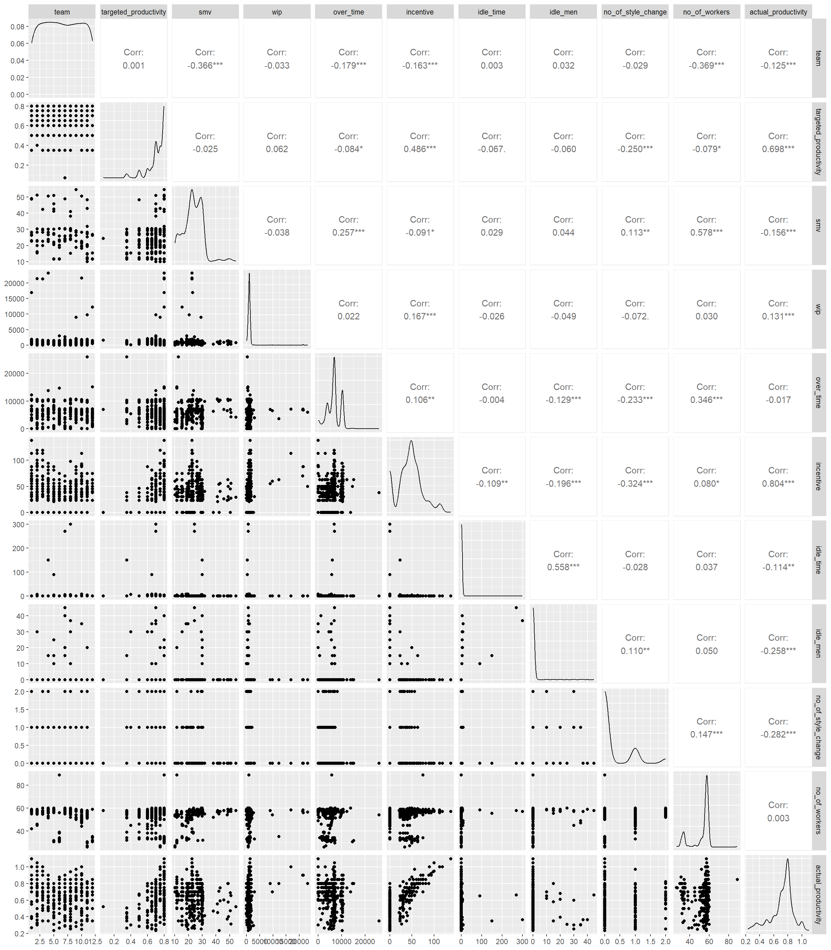 The response variable, actual_productivity is correlated with all the variables which is good. However, the explanatory variables are correlated within themselves which is not a good indication. This indicates there is some multicollinearity. This means two variables give similar information about the response variable. One way to mitigate the effect is to consider the principal components and then use the principal components for the models. Another way is to use some regularization to mitigate the effect of multicollinearity.