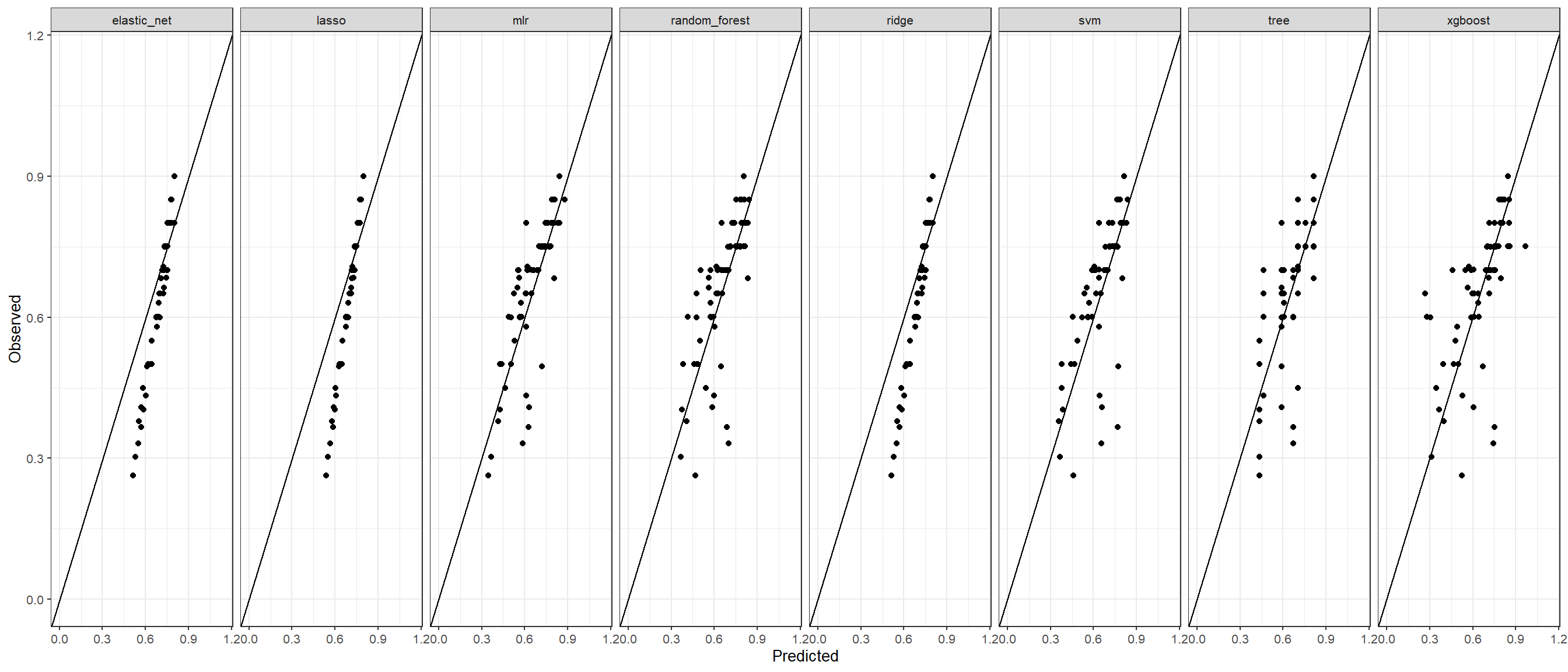 # Plot observed vs. predicted for all the modelsdf_pred <-rbind(df_pred_mlr,df_pred_l1,df_pred_l2, df_pred_en, df_pred_tree, df_pred_rf, df_pred_svm, df_pred_xgb)# Create a observed vs. predicted plot combined for all the modelsggplot(df_pred,aes(predicted,observed))+geom_point()+lims(x =c(0,1.15) , y =c(0,1.15))+labs(y ="Observed", x="Predicted")+facet_grid(~model, scales="free")+geom_abline()+theme_bw(base_size =10)
