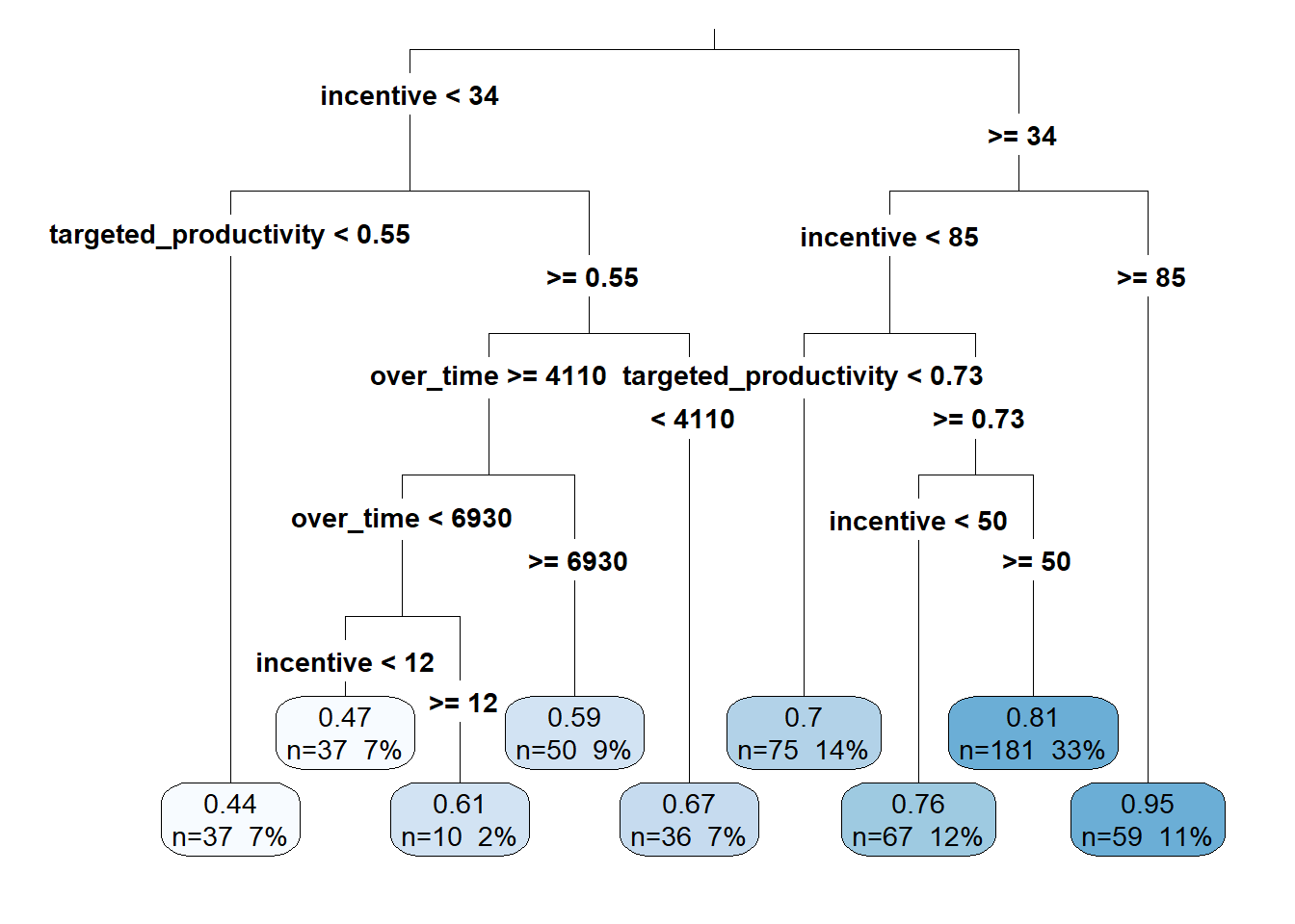 # Tree approachlibrary(rpart)library(rpart.plot)# Fit regression treemodel_tree <-rpart(actual_productivity ~ ., data = data_train, method ="anova")# summary(model_tree)# Plotrpart.plot(model_tree, type =3, extra =101, fallen.leaves =TRUE)