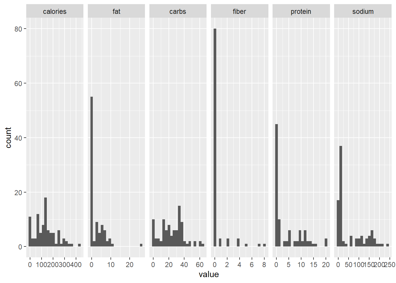 Now that we have the data ready, let us look at the histogram each of the variables namely calories, fat, carbs, fiber, protein and sodium