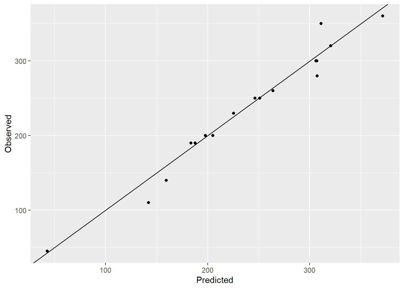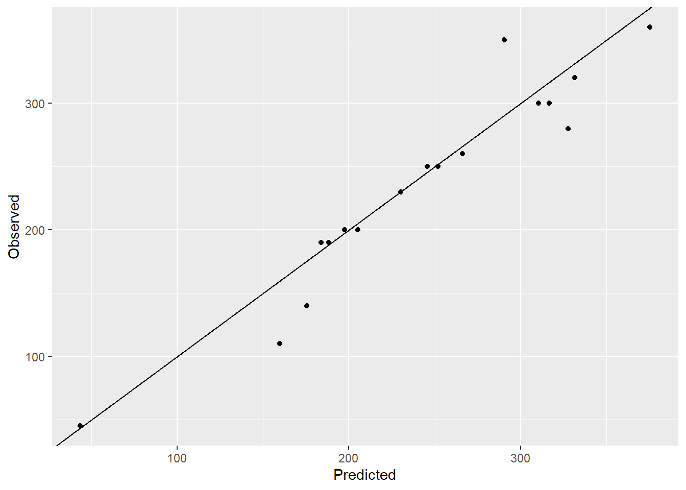 labs(y = "Observed", x="Predicted")+geom_abline()
