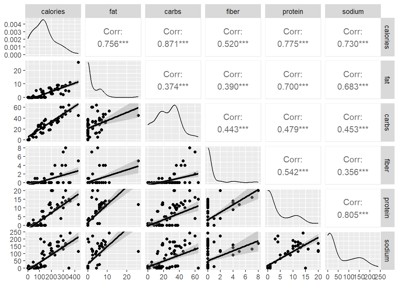 Most of the bivariate scatter plots indicate a linear relationship between the variables. The most important result according to us is the relationship between calories with all the other variables. We can now use the dataset for predictions where we try to predict the calories based o the fat, carb, fiber, protein and sodium content using multiple linear regression.